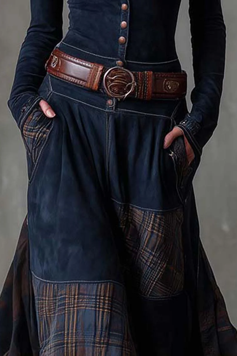 El vestido Amarilis combina la fuerza del estilo vintage con una elegancia bohemia atemporal. Confeccionado en ante ecológico azul marino y paneles de cuadros en tonos tierra, esta pieza une texturas y movimiento en un diseño que destaca por su carácter artesanal.